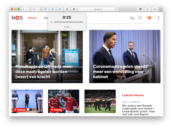 Het idee van Simple Refresh is zo simpel – de naam zegt het al – dat je je gaat afvragen waarom dit niet gewoon een standaardfunctie in Safari is. Maar dat is het niet, en dus is deze extensie handig. Simple Refresh installeert een knopje in de knoppenbalk van Safari, en als je daarop drukt, zie een simpele schuifknop waarmee je de herlaadsnelheid van de pagina kunt instellen. Van 1 seconde tot 10 minuten. Vervolgens klik je op 'Enable'. Heb je bijvoorbeeld voor 25 seconden gekozen, dan zul je zien dat de webpagina die je in beeld hebt staan, om de 25 seconden opnieuw wordt geladen. Superhandig als je het nieuws volgt. Niet handig als je iets wilt bestellen op BOL.com of als je een nieuwsbrief zit te typen in je browser... dus dan weer gauw uitzetten.
