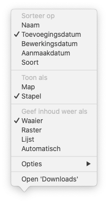 Meteen een andere tip erbij. Als je een map in je Dock hebt staan, dan bepaalt macOS doorgaans automatisch hoe de bestanden weergegeven moeten worden als je erop klikt: als een waaier (als het niet zo veel bestanden zijn) of in een raster (als het er wel veel zijn). De rasterweergave heeft wat extra's: je kunt erin scrollen, en je kunt submappen in zonder de rasterweergave te verlaten. Als je zelf wilt instellen hoe je het wilt hebben, ctrl-klik dan op de map in je Dock. Je krijgt dan dit menu te zien: