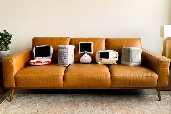 Je herkent natuurlijk meteen de de iBook G3, de iMac G4 en de Power Mac G5. Throwboy noemt ze niet zo... die merknamen mag de kussentjesmaker niet gebruiken. Dus heet de iBook G3 simpelweg '1999 Pillow' en de Power Mac G5 dus '2003 Pillow'. Het Apple-logo staat er ook niet op, al zou je van een afstandje denken dat dat wel zo is. In werkelijkheid tref je dit symbool aan: