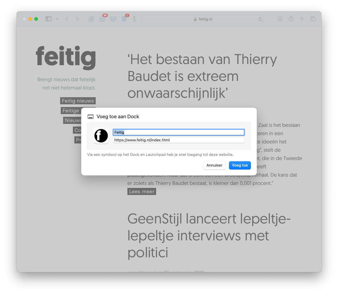Uiteraard zijn er nog veel meer handige dingen in Sonoma. Wat er voor ons uit springt: je kunt nu wachtwoorden delen met vertrouwde contacten (handig als het om een wachtwoord van Disney+ gaat, of iets anders dat je met huisgenoten deelt) en eindelijk kun je veelbezochte websites ook als ‘app’ opslaan in je Dock. Net zoals dat op je iPad of iPhone al jaren kan. Bezoek in Safari de site die je als webapp wilt bewaren, klik op Archief en kies ‘Voeg toen aan Dock…’ De rest wijst zichzelf.
