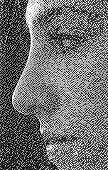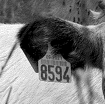 De foto is helemaal opgebouwd uit zwarte puntjes en streepjes. Er zijn geen grijstinten; de foto is 1-bit. Er is alleen maar zwart of geen zwart.