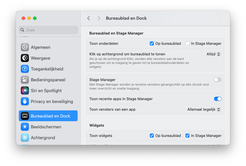 De komst van de widgets komt ook met een ander dingetje waar we even aan moesten wennen: als je ergens in je scherm op de bureaubladachtergrond klikt, schieten meteen alle vensters uit beeld en zie je je bureaublad. Dat is natuurlijk bedacht om snel bij je widgets te komen. Wij hebben alleen geen widgets, en we zijn ons inmiddels al 187 doodgeschrokken van wegspringende vensters, dus wij wilden die nieuwe functie graag uitzetten. Dat kan wel – min of meer. In de Systeeminstellingen vind je onder Bureaublad en Dock de optie ‘Klik op achtergrond om bureaublad te tonen’. Met een dropdown-menuutje met twee opties. ‘Uit’ is er daar vreemd genoeg niet eentje van. Je kunt alleen kiezen uit ‘Altijd’ of ‘Alleen in Stage Manager’. Vreemde keuze. Wij kozen dat laatste, en aangezien we sowieso geen Stage Manager gebruiken, is alles weer zoals het vroeger was.