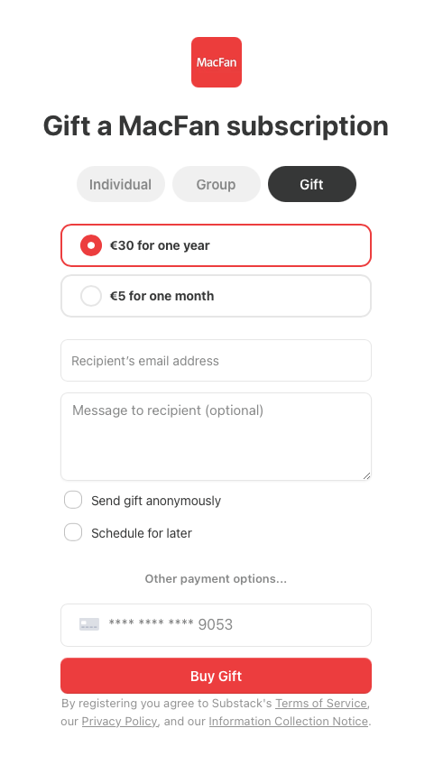 Dit is een extra editie van MacFan, die we naar alle inschrijvers op onze nieuwsbrief sturen. De reguliere maandelijkse editie is alleen voor betalende abonnees. Nu horen we wel eens van mensen dat ze wel een abonnement zouden willen nemen, maar geen terugkerende automatische betaling willen. Daar hebben we een oplossing voor! Je kunt MacFan namelijk ook cadeau doen – en zo’n cadeau-abonnement verlengt zichzelf niet. En nu kun je dat cadeau aan iemand anders geven, maar natuurlijk ook aan jezelf. Dus wil je wel een abonnement, maar geen terugkerende betaling, ga dan naar deze pagina. Je ziet dan dit: