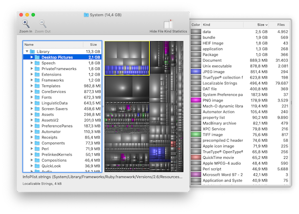 In de kolom links zie alle submappen van de systeemmap. Ze staan al meteen gesorteerd op grootte; de grootste bovenaan. Bij ons is dat een map van 2,1 GB gevuld met 'Desktop Pictures'. Bureaubladachtergronden die standaard in macOS zitten dus. Daar kun je er door de loop van de tijd aardig wat van verzamelen.