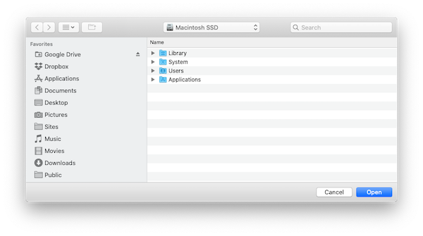 Je ziet een paar mappen, zoals 'Users' en 'Library'. Laat die met rust... kies voor de map 'Systeem'. Selecteer die, en klik op de knop 'Open'.