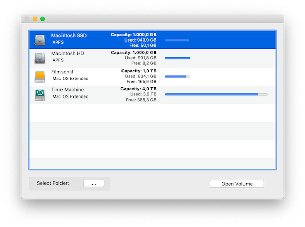 Zodra de app is opgestart, moet je een schijf selecteren om te inventariseren. We willen de systeembestanden in kaart brengen, dus kies de opstartschijf van je Mac. Dubbeklik niet, maar selecteer slechts, en klik dan linksonder op de knop 'Select Folder'. We willen namelijk niet de hele schijf gaan inventariseren (dat duurt een eeuwigheid), maar alleen de systeemtroep.