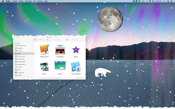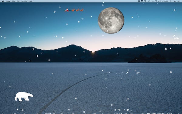Maar misschien moeten we eerst even zeggen wat iSnow is. Het is een appje dat wordt gemaakt door de Nederlandse ontwikkelaar Rick Jansen, en je vrolijkt het bureaublad van je Mac ermee op door allerlei effecten toe te voegen: naar beneden dwarrelende sneeuw, de kerstman die af en toe voorbij vliegt met zijn rendieren, het noorderlicht dat de hemel verkleurt, een ijsbeer die door je scherm wandelt. Elk onderdeel (en er zijn er nog wat meer) kun je individueel aan en uit zetten, en je kunt per onderdeel allerlei variabelen instellen. Leuk om mee te spelen. Een tijdje geleden maakte Rick een andere app: iMaan, waarmee je de beweging van de maan op je bureaublad kunt zien. Die functionaliteit zit nu ook in iSnow. Nog even en je kunt ook browsen in iSnow, of een spreadsheet maken...