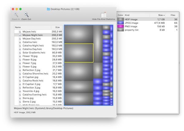 Als we dubbelklikken op de map 'Desktop Pictures', laat Disk Inventory X alleen nog de inhoud van die map zien. Klik een bakje aan, en je ziet in de regel onderin om welke achtergrond het gaat. In de schuiflade zie je bovendien hoe sommige afbeeldingstypen veel meer ruimte innemen dan andere: HEIF-bestanden nemen 1,7 GB in beslag; JPG-afbeeldingen slechts 477,4 MB. In dit geval zou je ervoor kunnen kiezen wat achtergronden die je niet aanstaan, te verwijderen.