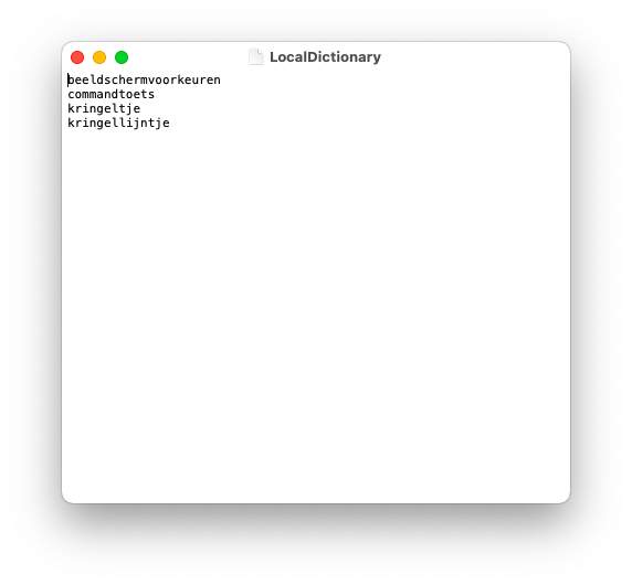 Je kunt die LocalDictionary ook gewoon bewerken. Open hem in Teksteditor, en je ziet de lijst van geleerde woorden. Je kunt woorden toevoegen (elk woord steeds op een nieuwe regel) of woorden verwijderen.