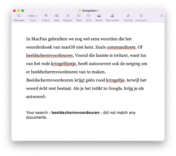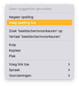 Dat je Mac je spelling kan controleren, is superfijn. Een rood kringeltje onder een woord betekent meestal dat het verkeerd is gespeld. Maar soms ziet je tekst rood van de kringeltjes, maar is er niks fout... macOS kent alleen de woorden die je gebruikt niet. Wij hebben dat vaak, met woorden als commandtoets en beeldschermvoorkeuren. Om te voorkomen dat daar steeds correctiekringeltjes onder staan – of nog erger: dat autocorrect het woord aanpast – is het handig om die woorden aan je Mac te leren. Dan kan heel makkelijk: doe een ctrl-klik op het niet-herkende woord, en kies dan 'Voeg spelling toe' ('Learn spelling' in Engelstalige apps). macOS zal nooit meer zeggen dat dit woord verkeerd is gespeld.