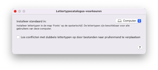 Open vervolgens het programma Lettertypecatalogus, en sleep de inhoud van die twee mappen daarin. Al die fonts worden geïnstalleerd. Mogelijk staan sommige fonts er nu twee keer in, maar geen zorgen: Lettertypecatalogus ziet dat, en zal je vragen wat het met de dubbele bestanden moet doen.Voordat je fonts installeert met Lettertypecatalogus, is het goed om na te denken in welke map het programma die fonts moet installeren. In de map die alleen voor jou is, of in de map die voor alle gebruikers van je Mac is? Dat laatste is eigenlijk wel zo handig. Dan staat alles maar gewoon in één map. Open de voorkeuren van Lettertypecatalogus, en stel in dat lettertypes standaard in 'Computer' moeten worden geïnstalleerd, en niet in 'Gebruiker'.